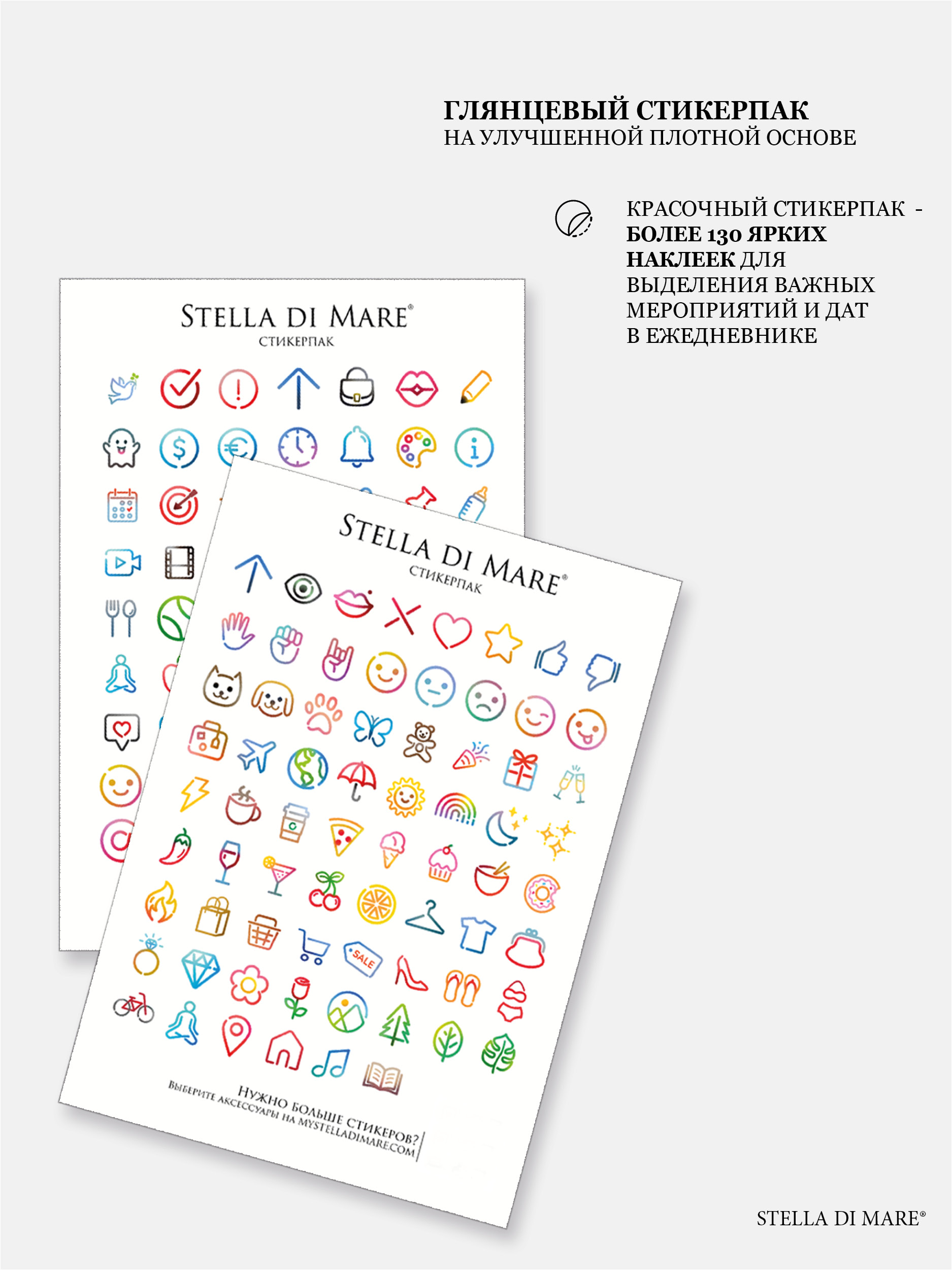 - 2 листа полноцветных стикеров на плотной глянцевой основе - более 130 ярких наклеек для выделения важных событий и украшения ежедневника.