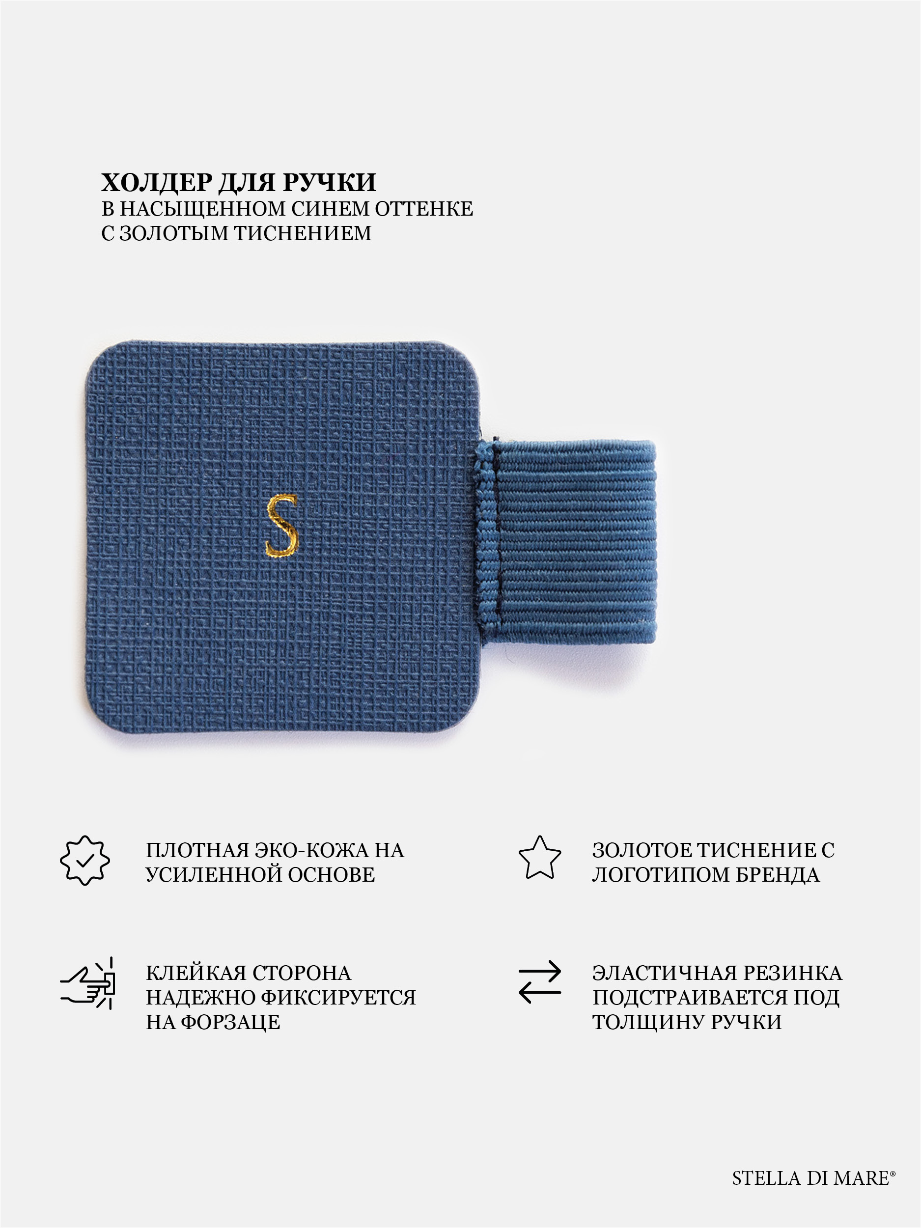 - Холдер для ручки из эко-кожи на плотной клейкой основе, цвет синий.