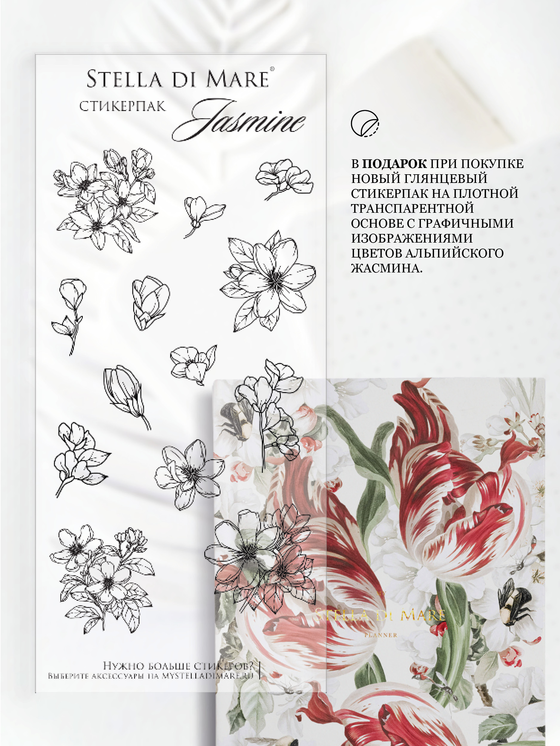- Новый стикерпак Jasmine на транспарентной основе с графичными изображениями горного жасмина.