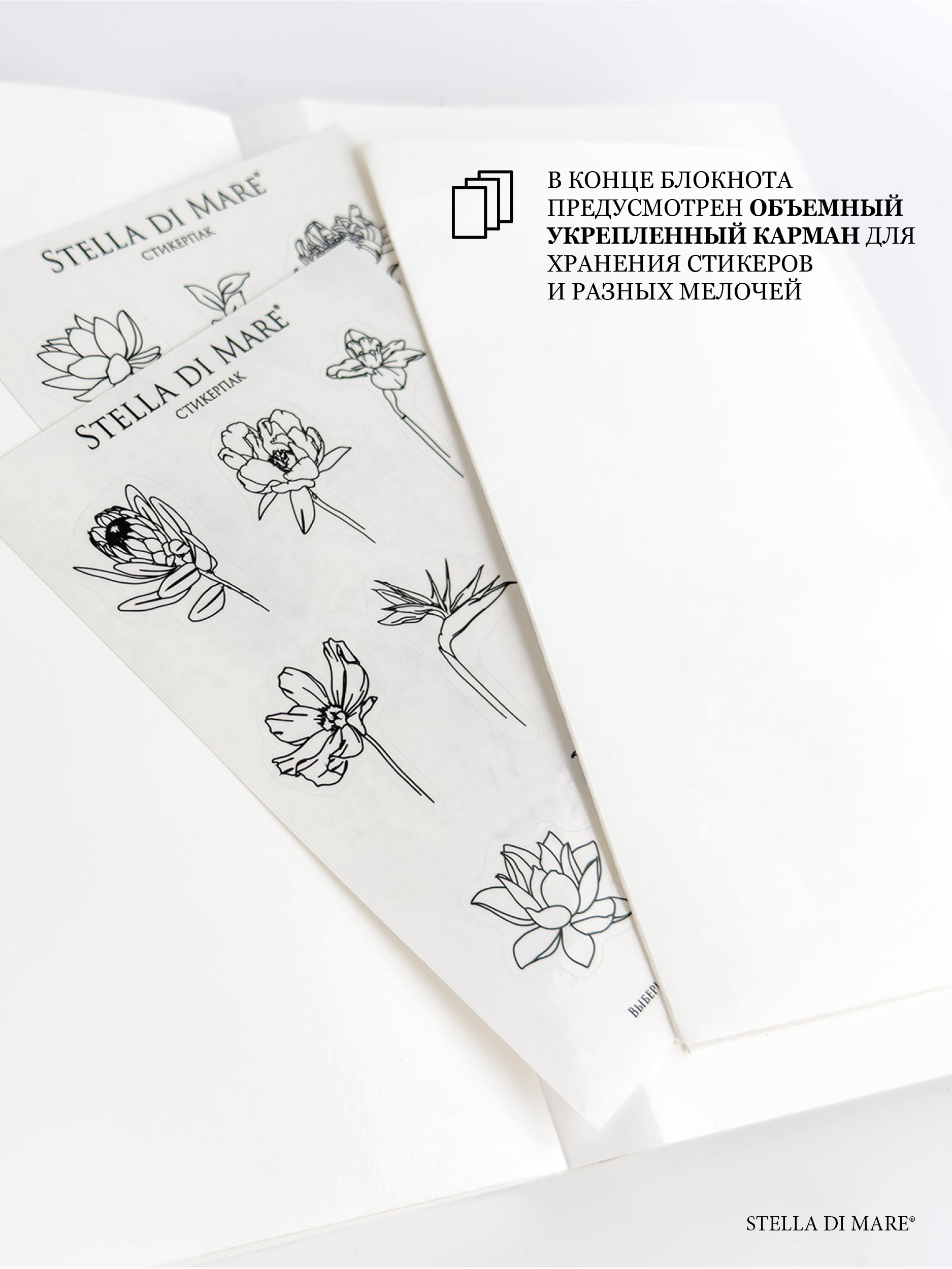 - Транспарентный стикерпак с графичным флористическим принтом на плотной глянцевой основе.